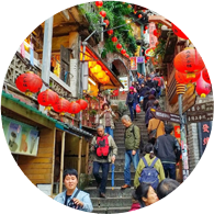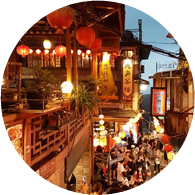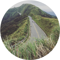 想要欣賞九份這個曾經繁華絢麗的黃金山城,騎單車,慢行遊看九份自然美景,也是另一種體驗,102縣道(瑞雙公路)被譽為台灣經典公路之一,在這路段上到處擁有絕美的景色,也是不少喜愛單車之人的挑戰熱門路段,而位於102縣道上在雙溪與九份交界處附近,有座『不厭亭』,總是讓許多車友們流連忘返;站在涼亭的山頂上可眺望雙溪、瑞芳在山腳下的美景,而延綿不斷的山脈與公路相依相隨,直到消失在盡頭,此處的景色也吸引不少遊客慕名而來。另外在縣道19k處的『樹梅觀景台』,遼闊的視野可鳥瞰四周的山脈及九份、金瓜石等地區。